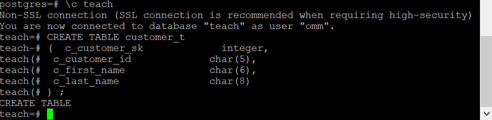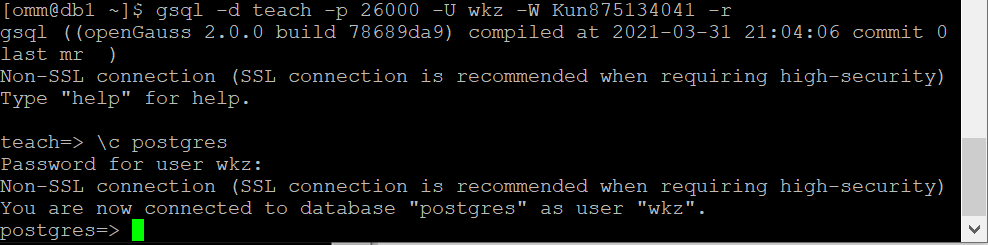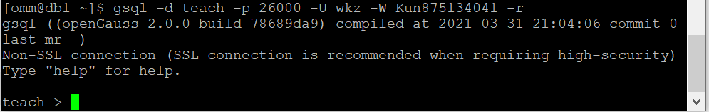 gsql -d teach -p 26000 -U wkz -W Kun875134041 -r