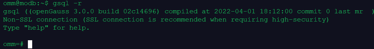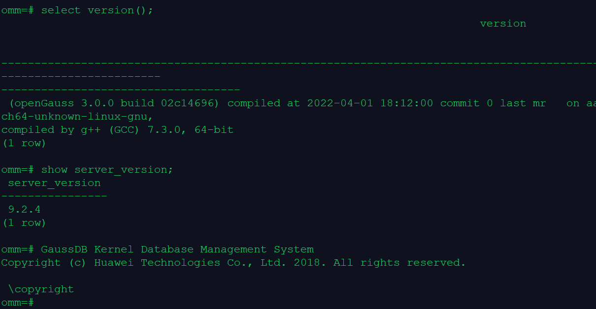 gsql -d omm -p 5432 -r首先切换为超级用户omm,然后输入gsql -r进入数据库