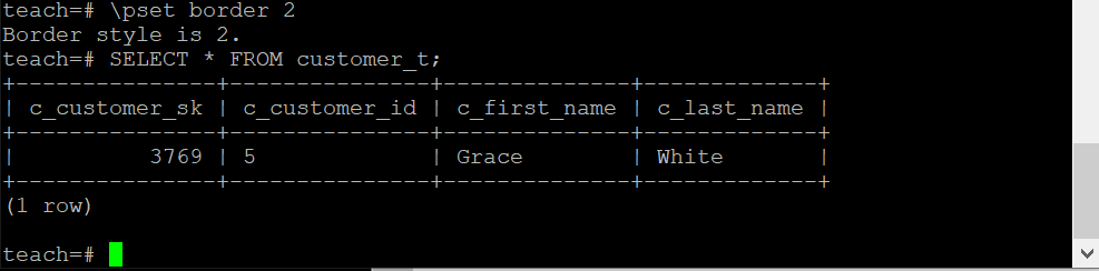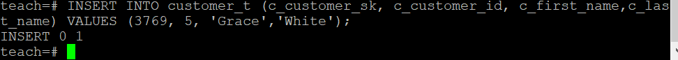 INSERT INTO customer_t (c_customer_sk, c_customer_id, c_first_name,c_last_name) VALUES (3769, 5, 'Grace','White');