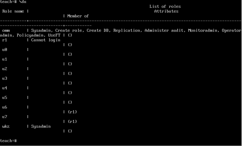 4、-- \du 显示数据库集簇中目前有哪些用户和角色: