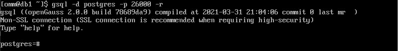 gsql -d postgres -p 26000 -r注:如果给自己创建的数据库创建了用户,且这个用户有登录数据库的权限,那么就还需要用户名和密码