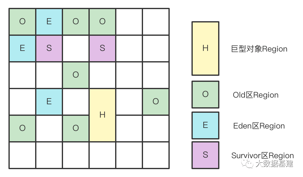 为什么CMS垃圾回收器长时间运行无法避免FGC?本质是因为CMS垃圾回收器中老年代采用标记清理算法,这种算法会产生较多内存碎片,当内存碎片很碎无法给对象分配出连续空间的时候,JVM就会触发FGC整理老年代。那有些同学就会问为什么不在每次老年代GC的时候执行整理操作呢?这主要是因为老年代如果很大的话,整理一次STW的时间会不可控。那怎么破这个局呢?JVM设计者提出了一个思路:老年代不是很大吗,那就将老年代划分成很多小的格子,在此基础上GC算法基本不变,还是先标记,不过在标记完成后,按照优先级选择部分格子使用复制算法进行整理,这样每次整理的内存空间是可控的,STW的时间就相对可控,而且因为使用复制算法就不再会出现内存碎片。对,这就是G1垃圾回收器的核心设计思想。G1 是一个分代回收器,它依然保留了"ParNew+CMS"垃圾回收器中新生代和老年代的分代逻辑。但与"ParNew+CMS"回收器不同的是,它引入了一个新的数据结构 - Region,也就是上文中笔者提到的小格子。G1垃圾回收器会把整个堆划分成一个个大小相等的Region,每个Region的大小可以通过参数设置,通常大小在1~32M之间,默认大小取决于总堆的大小。下图是G1回收器堆划分的示意图: