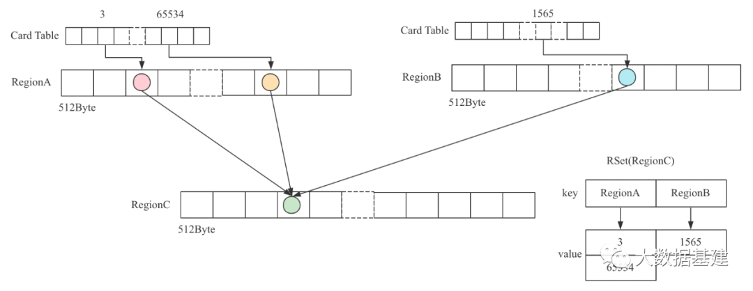 《一文看懂"ParNew+CMS"垃圾回收器》文章在介绍对象标记的时候重点说明了一个对象跨代引用的问题。比如YGC阶段标记新生代对象的时候,不仅需要扫描GC Roots标记其直接引用的新生代对象,还需要扫描所有老年代对象,查看其是否引用了新生代对象,如果引用了的话,对应新生代对象也是需要标记的,否则就会发生漏标。然而实际实现中,扫描整个老年代对象的代价相当大。文章中我们介绍了可以通过Card Table这种数据结构大幅降低扫描老年代对象查找跨代引用的代价,简单来说,就是通过写屏障技术在老年代对象引用新生代对象的时候将Card Table对应Card设置成"脏卡",这样的话,查找跨代引用,只需要扫描Card Table脏卡对应的老年代区域,而不需要扫描整个老年代,大大降低了扫描代价。根据上文介绍,G1也是一个分代回收器,也需要处理跨代引用扫描代价大的问题。为了解决这个问题,G1引用了另一种新的数据结构 - Remembered Set,简称RSet。2.1 RSet是什么样的数据结构呢?