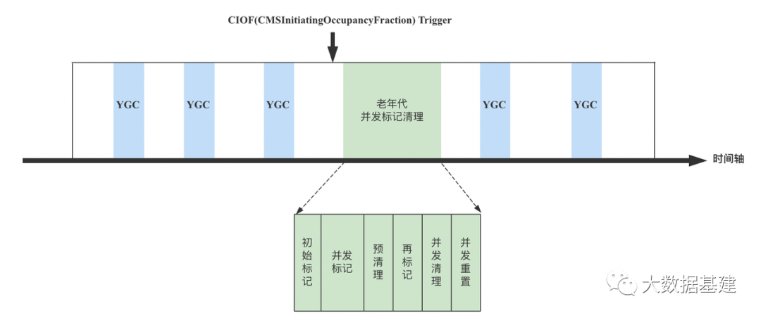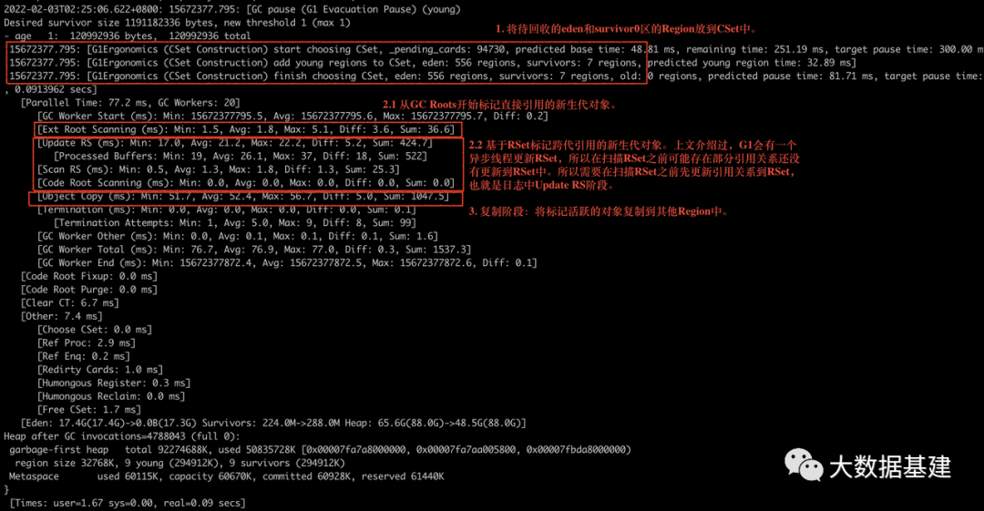 和"ParNew+CMS"一样,一旦Eden区满了之后,就会触发YGC。YGC只负载回收堆中新生代的所有Region,不回收老年代的Region。基本流程可以表示为如下几步:(1)将eden区和survivor区所有Region添加到CSet中准备回收。注:CSet是一个存放待回收Region的数据结构。(3)复制阶段:将标记活跃的对象复制到其他Region中。为了更加清楚的明白上述步骤,下图是一次真实的YGC日志片段,可以对照着上述流程来看。