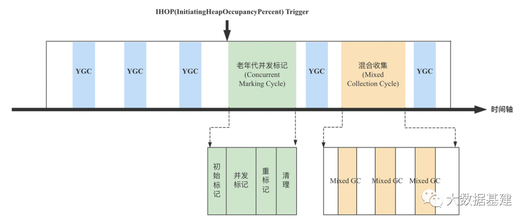 对比"ParNew+CMS"回收器工作流程,G1中同样会比较频繁地进行新生代YGC,同样也有老年代并发标记周期。不同的是,G1在并发标记之后并没有直接清理全部垃圾对象,而是新增了一个混合收集周期,这个周期包含多次Mixed GC,每次Mixed GC只会回收部分Region,直至未处理Region集合占比低于特定阈值。之所以将这个周期称为"Mixed Collection Cycle",是因为每次Mixed GC都会同时回收新生代和老生代中的Region。上图中,IHOP(InitiatingHeapOccupancyPercent) Trigger代表"并发标记周期"触发的阈值。一旦当前JVM已使用内存/总堆内存超过这个阈值,就会触发并发标记。虽然G1回收器的工作流程和"ParNew+CMS"回收器差的不是很多,但是每个核心步骤的具体实现却有很大的不同。接下来分别来看G1中的YGC、Concurrent Marking Cycle以及Mixed GC的一些核心实现细节。