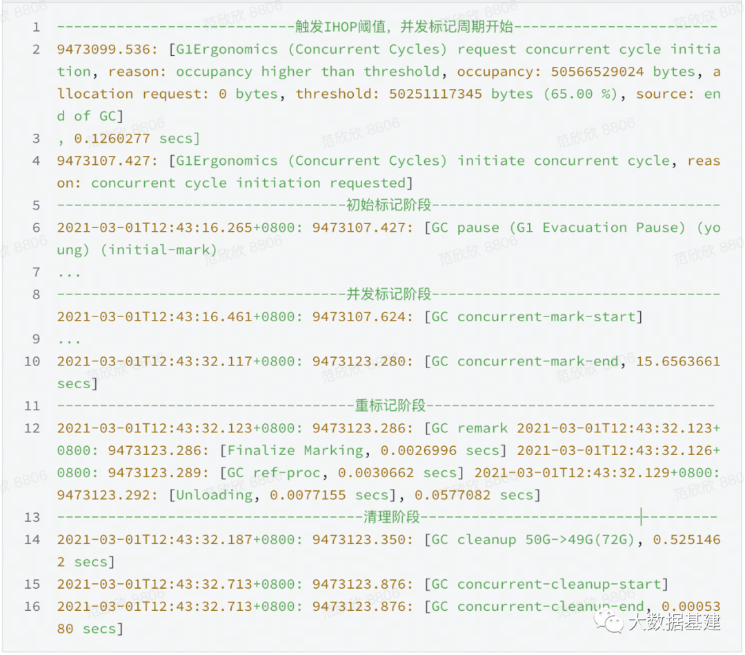 根据上文介绍,一旦"JVM已使用内存/总内存"的比例超过设定阈值IHOP(InitiatingHeapOccupancyPercent)后,G1会执行一次Concurrent Marking Cycle,并在之后进行多轮Mixed GC。和CMS回收器基本一样,G1中一轮并发标记周期包含初始标记、并发标记、重新标记,再加上一个cleanup阶,这样就可以完成整堆所有Region的对象标记。下面是一段G1回收器中并发标记周期的完整日志: