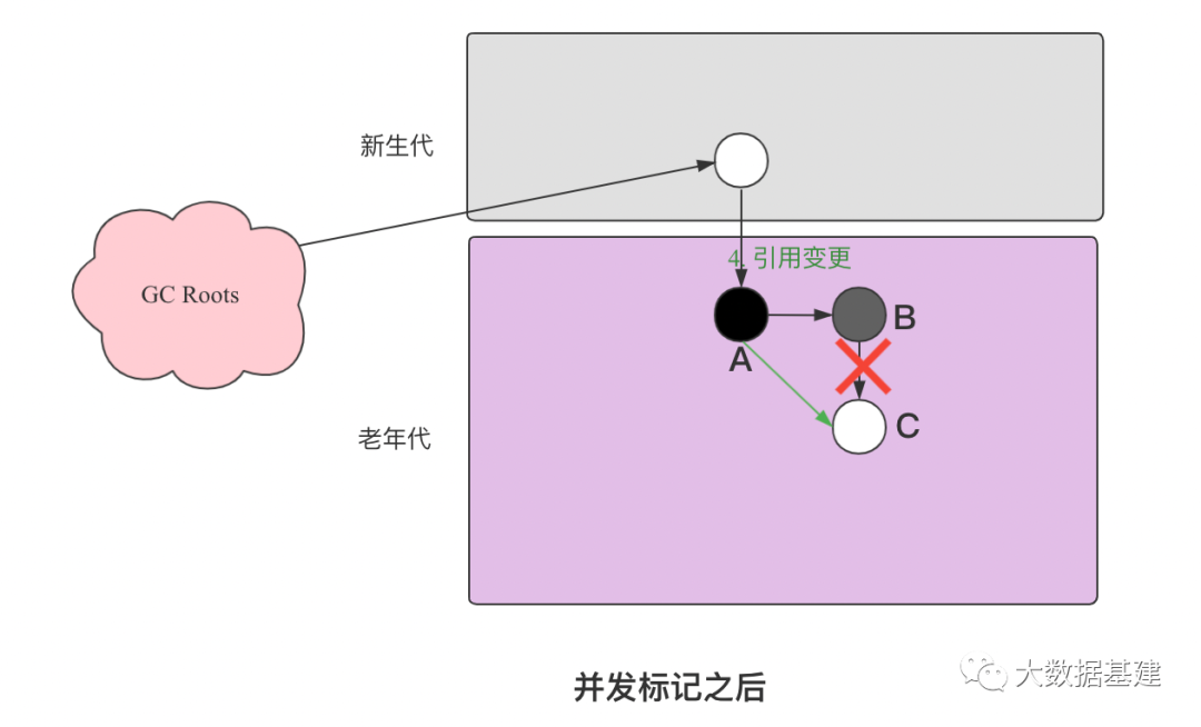 在这种背景下,应用线程此时发生了一次引用关系变更,B引用C的关系被删除了且同时A引用了C,即如下所示代码:objB.fieldC = null;