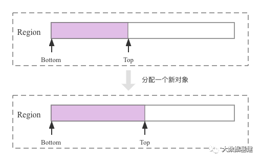 了解了SATB算法的核心思想之后,再来看看这个算法是如何实现的。G1回收器将堆内存分成一个一个Region,在Region中分配对象时,对象都是连续分配的。这里介绍两个指针:Bottom指针和Top指针,其中Bottom指针指向Region的初始位置,Top指针指向下一个对象分配的内存位置,如果有新的对象分配,就将Top指针向前移动。如下图所示:
