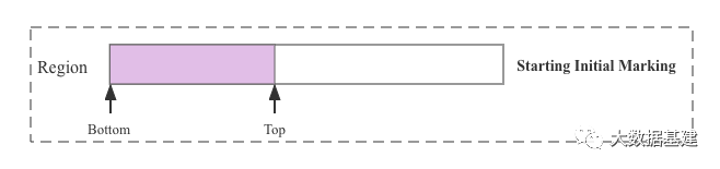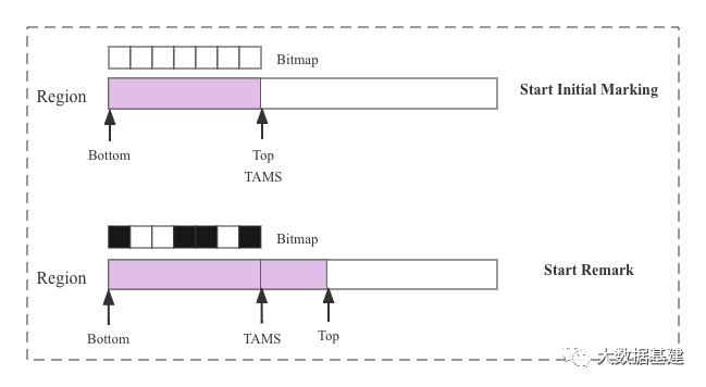 这个时候要进行一轮完整的并发标记周期,按照上面的说法是要先给这个Region打个快照,这个快照实际上就是[Bottom, Top)现在这块内存区域。但是在并发标记周期内,因为有引用线程在分配对象,所以Top指针肯定会往前移动,所以为了将标记开始前Top这个位置记录下来,需要定义另一个指针TAMS(全称Top-At-Mart-Start)指向标记前Top这个位置,从Top-At-Mark-Start这个字面含义就可以理解是标记开始时Top指针所在位置,这样快照所代表的内存区域就是[Bottom, TAMS)这块,并发标记过程中标记线程就基于这块内存对象进行标记,后面Top指针就可以随意往前移动了。所以按照正常的逻辑应该是这样: