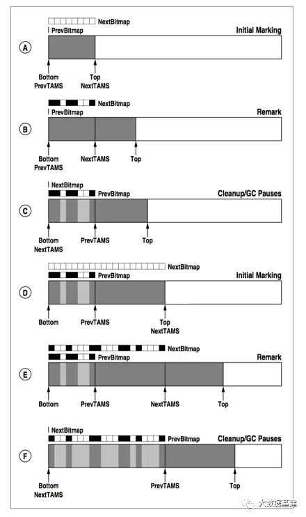 - 应用线程新分配的对象都认为是活跃对象,实际在下一个并发标记周期进行标记。上文说过漏标发生的第一种场景是"应用线程在并发标记过程中新生成的活跃对象因为某些原因没有被标记线程标记",那如果能够将标记阶段新分配的对象全都集合到一起,这些对象全部都标记为活跃对象(实际肯定会有部分垃圾对象,将垃圾对象标记为活跃对象不影响程序正确性)就可以解决这个问题。