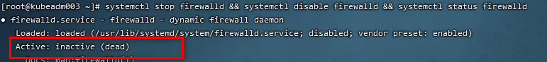 systemctl stop firewalld && systemctl disable firewalld && systemctl status firewalld