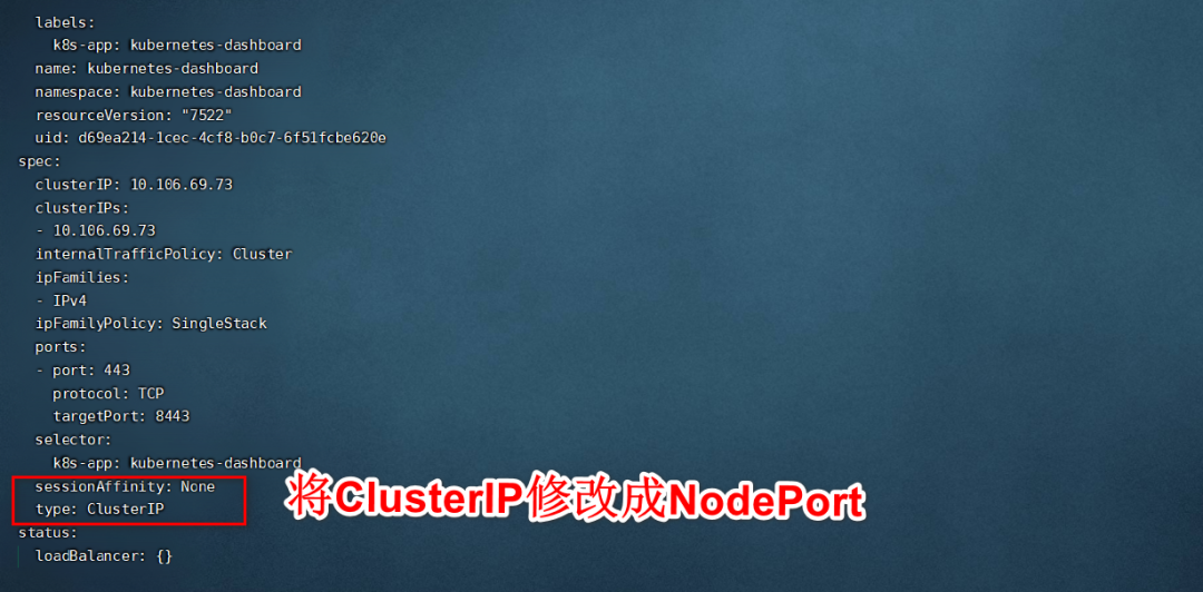 kubectl edit svc kubernetes-dashboard -n kubernetes-dashboard