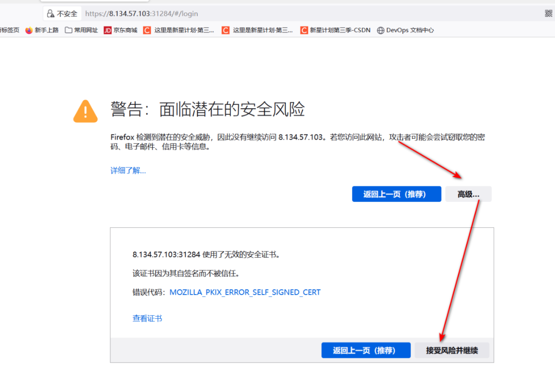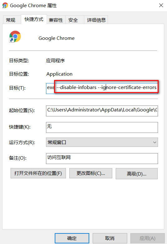 错误解决:可能会出现dashboard打不开的情况,在谷歌浏览器,点击属性,在尾部添加--disable-infobars --ignore-certificate-errors