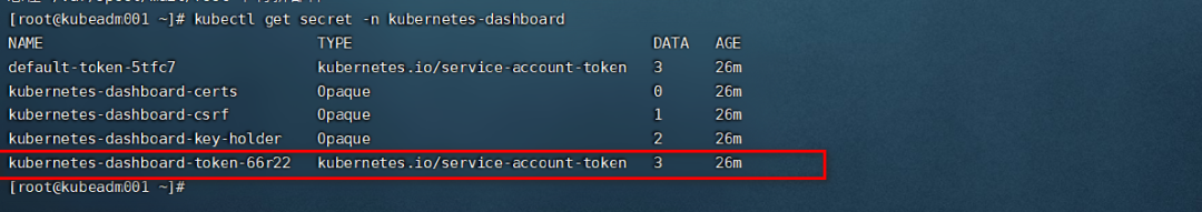 查看kubernetes-dashboard名称空间下的secret