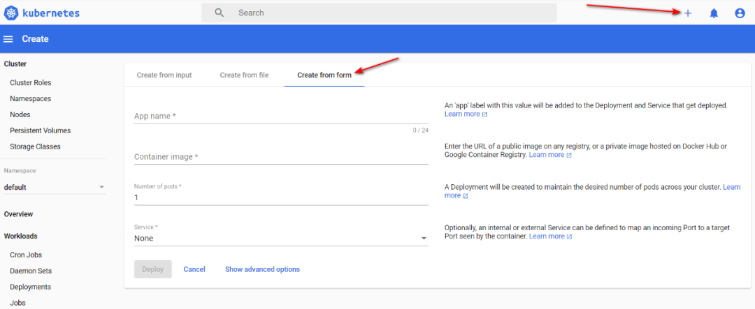 打开 kubernetes 的 dashboard 界面点开右上角红色箭头标注的 “+”,如下图所示: