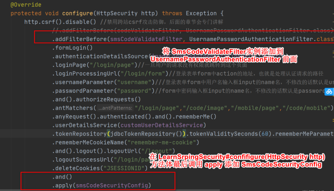 .addFilterBefore(smsCodeValidateFilter, UsernamePasswordAuthenticationFilter.class)