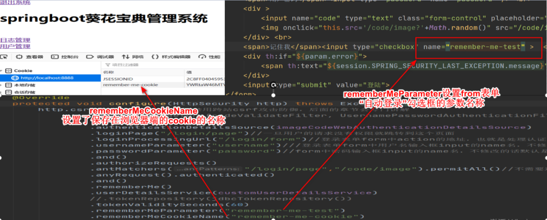 rememberMeParameter设置from表单“自动登录”勾选框的参数名称。如果这里改了,from表单中checkbox的name属性要对应的更改。如果不设置默认是remember-me。 rememberMeCookieName设置了保存在浏览器端的cookie的名称,如果不设置默认也是remember-me。如下图中查看浏览器的cookie。