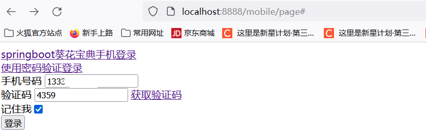 重启项目,访问 http://localhost:8888/mobile/page输入手机号与验证码, 勾选 记住我 , 点击登录