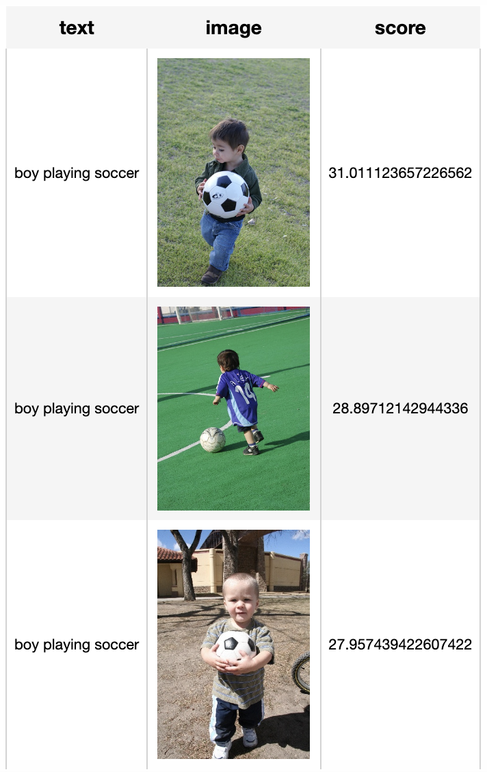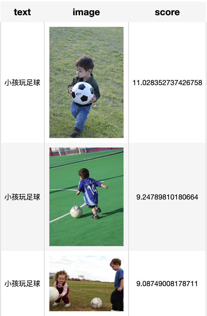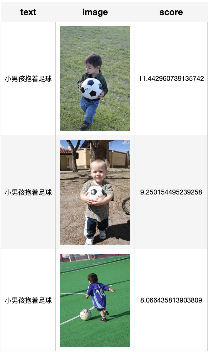 通过查询“小孩玩足球”、“小男孩玩足球”、“小男孩抱着足球”,我们对比前三名的搜索结果可以观察到该系统成功实现了文本描述与图片内容的匹配。当文本描述出图片之间的差别时,相似度之间的差异会变得更加明显。