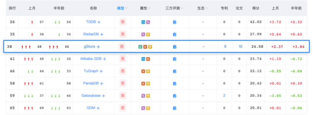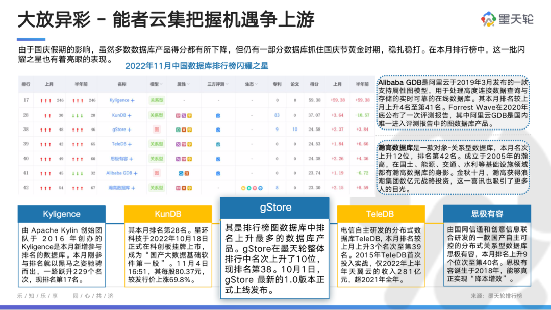墨天轮国产数据库流行度排行于2019年6月推出,通过近50个维度的数据来考察近300个国产数据库的流行度排行,作为专注于国产品牌的观察者和数据库行业发展的见证者,墨天轮的排行榜的专业度、影响力、权威性等方面一直在国产数据库方面保持领先地位。gStore于10月重磅发布1.0版本,在本期的墨天轮数据库排名中从246个数据库其中27个国产图数据库中脱颖而出,在搜索引擎、趋势指数、三方评测、生态、专利数、论文数等维度具有突出表现,综合排名在图数据库领域上升至第三名。本次的排名上升是对gStore在图数据库领域的技术实力、成果落地和创新能力的高度认可。北京大学团队在深耕图数据管理的前沿理论和方法,发表一系列顶级数据库领域国际会议和期刊论文的同时,不断打磨gStore内核和产品功能,并不断完善产品生态,全面兼容国产CPU(鲲鹏、飞腾、海光、兆芯、申威)和国产操作系统(银河麒麟、中标麒麟、统信UOS、欧拉等),积极打造图数据库”中国芯”。第三方权威机构测评表明gStore相关性能和功能已走在国际前列,并于2021年通过中国信通院的《图数据库基础能力专项评测》。同时,我们秉持开放共享的理念将单机内核版本进行开源,并保持每半年一个版本的更新速度。此外,我们积极打造社区、云平台试用版、开发手册、社群、公众号等来降低产品使用门槛,帮助广大图数据库从业者快速上手。10月上线的gStore 1.0版本正式上线发布。gStore是由北京大学王选计算机研究所数据管理实验室(PKUMOD)研发的面向知识图谱的开源图数据库系统。不同于传统基于关系数据库的知识图谱数据管理方法,gStore原生基于图数据模型(Native Graph Model),维持了原始知识图谱的图结构,将面向RDF知识图谱数据的SPARQL查询,转换为面向RDF图的子图匹配查询,利用我们所提出的多种图结构索引和查询优化机制,达到了在百亿规模的图上的秒级查询响应,相关研究成果发表多篇数据库领域顶级会议/期刊论文,前期理论成果获得教育部自然科学二等奖(《大规模图结构数据管理》)。gStore系统源于2011年北京大学邹磊教授在VLDB发表的论文:“gStore: Answering SPARQL Queries via Subgraph Matching”。北京大学邹磊教授团队十余年在坚持图数据管理领域不断原始学术创新的同时,带领团队深耕图数据库系统,坚持开源gStore图数据库系统的持续更新。同时,2021年以来,邹磊教授领导的北京大学重庆大数据研究院图数据库与知识图谱实验室,在gStore产品生态中持续打造和完善知识图谱一体化平台,并在今年8月的2022中国国际智能产业博览会北京大学重庆大数据研究院科技创新成果发布会发布了“知识图谱一体化平台系统”(KGS),支持用户更加方便和高效地建设知识图谱项目。gStore官网:http://www.gstore.cn/PKUMOD实验室主页:https://mod.wict.pku.edu.cn/GitHub:https://github.com/pkumod/gStore Gitee:https://gitee.com/PKUMOD/gStore