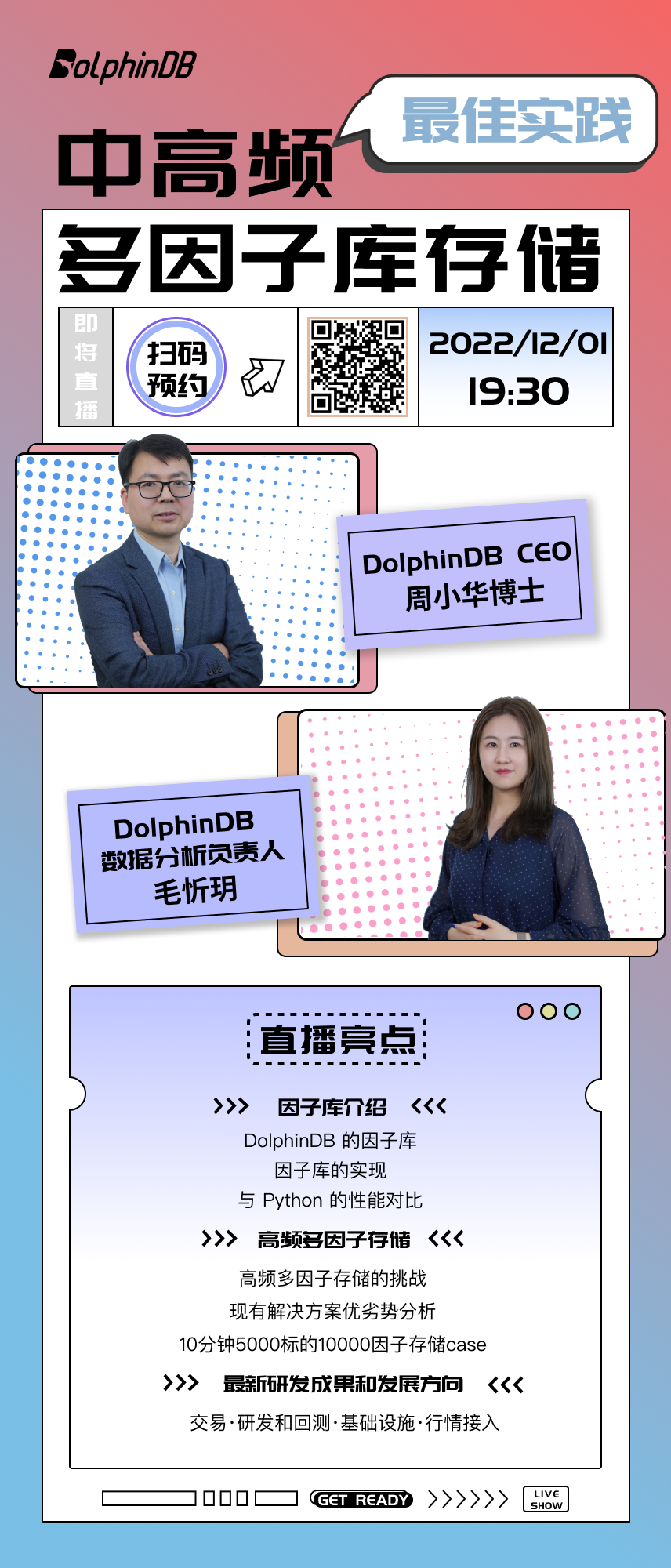 除了国泰君安 191 Alpha 因子库外,DolphinDB 还实现了一系列其他常用因子库,并为用户提供了高性能的高频多因子存储解决方案。2022年12月1日(周四)晚7点半,DolphinDB 创始人周小华博士与数据分析负责人毛忻玥,将在直播间开讲,为大家带来有关「高频多因子库存储最佳实践」的深入分享。