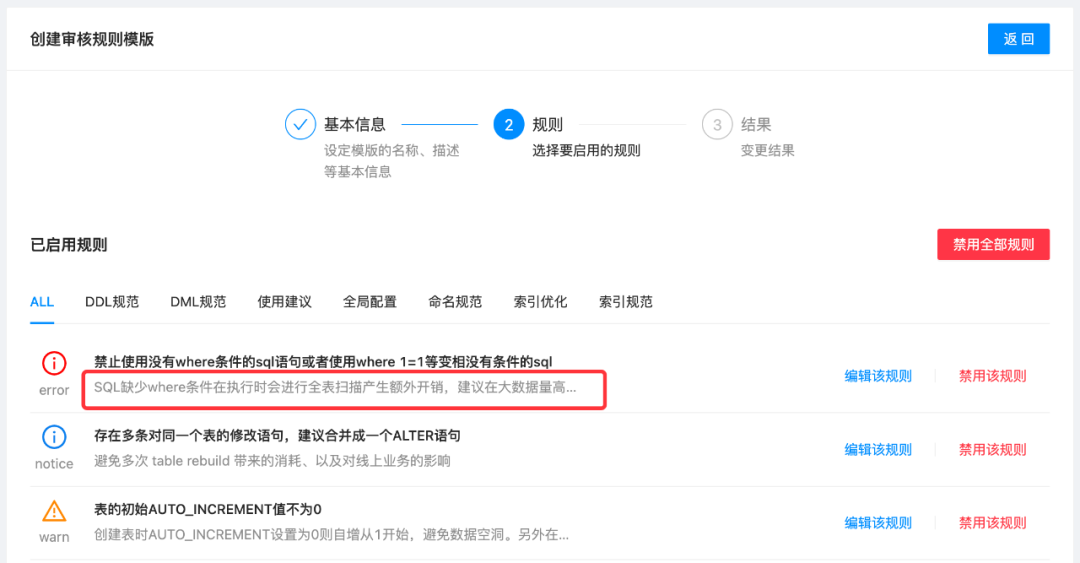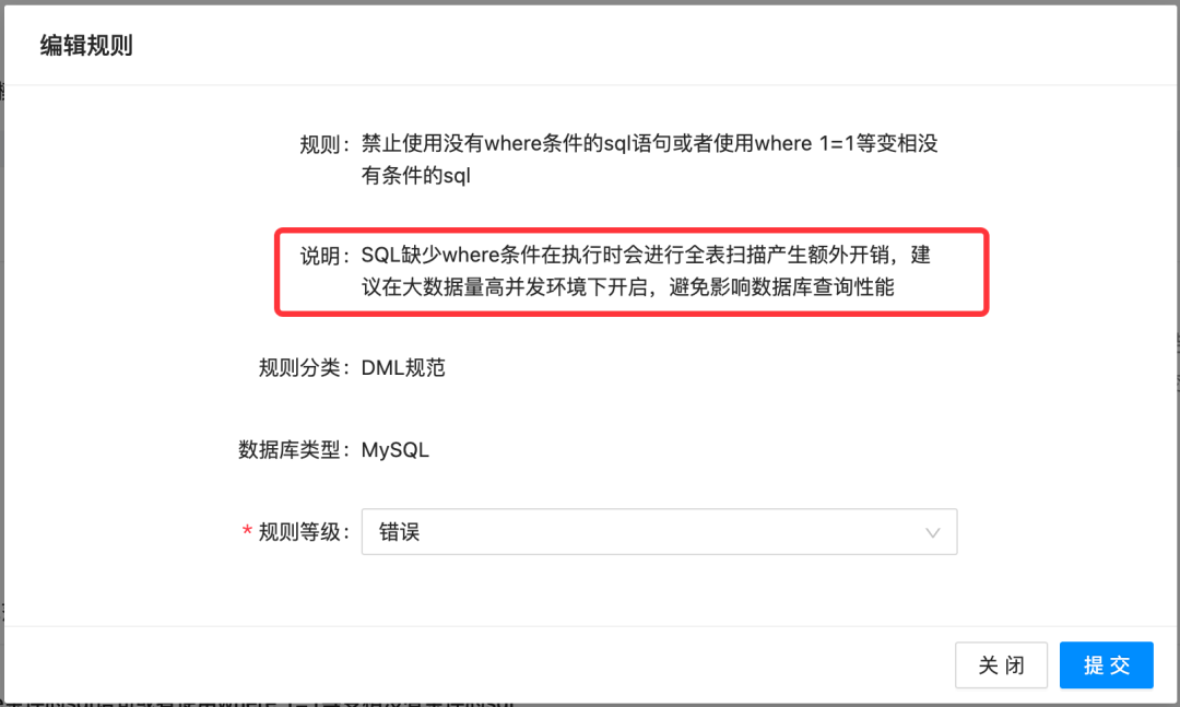 本期SQLE的审核规则新增了更详细的说明。在此之前,SQLE社区版已经支持了100+条MySQL规则,面对这么多规则一些用户不太清楚应该怎么去制定一套规则集。在初次入手时显得不知所措,因此,本次将内部规则的说明通过SQLE展示出来,这些说明包括规则要避免的问题,如何解决问题等。该功能给如何制定规则标准参考依据,并使得开发人员更方便理解规则,学习规则。在全局规则页面查看规则,或编辑规则模板时,可以看到这些内容,效果如下图所示: