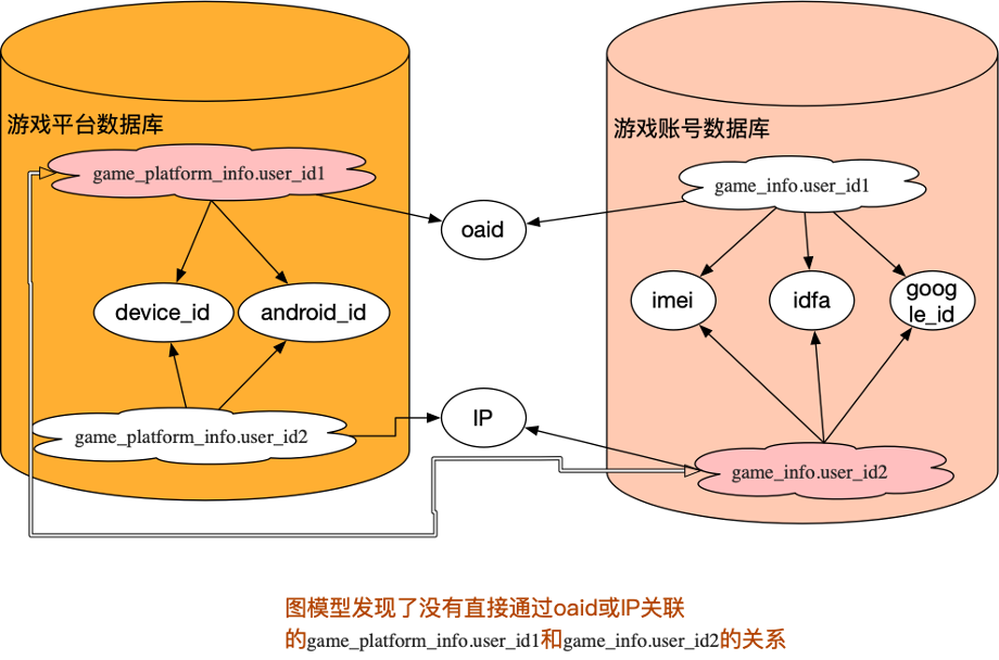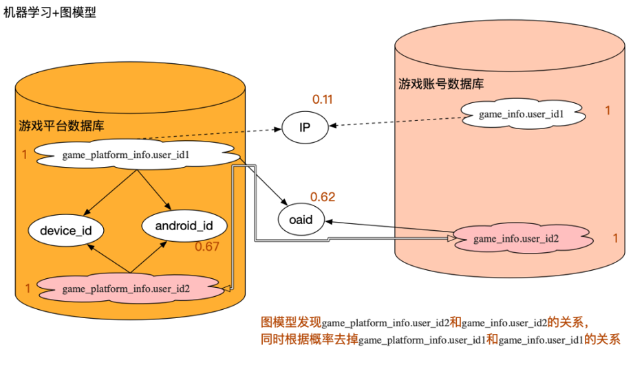 然后将无线设备挂靠到核心账号上来,在这里就是device_id、android_id、googleid等挂靠到自然人uid上来。一种idmapping方案是根据经验,将game_platform_info和game_info直接通过表join的方式,按指定列(如oaid、ip)关联起来,同时遍历所有没有指定列的设备id(device_id、android_id、googleid等),将能够匹配的设备id关联起来。这种方式优势在于思路清晰,可解释性强,开发成本低。既然要把id进行关联,那把id完全相同的值关联就可以了。但这个方案也有很多缺点,第一,它是以完全匹配的方式,必须某个id完全相等才能认为是同一id,匹配较“硬”,泛化性不够。第二,对异常数据处理能力较弱,无法进行多源判断。它是以表join的形式关联,即如果这两个表中各自存在一行中的某两个字段相同,那么这两个表的这一行的其他数据就关联到一起了,即使这两个字段可能是因为错误而匹配的,也只能继续错下去。第三,无法利用正确的信息进行优化,如果我们已知一组正确的关系数据,比如知道一组game_platform_info.user_id、game_info.user_id的映射关系,我们无法在表join的框架下利用这些关系优化idmapping的结果。另一种idmapping方案是基于机器学习模型来完成的。这种通常是在有一些标注数据的前提下,利用这些已有的映射关系,构建特征,判断给定的两个id是否属于同一个人。游戏中存在一些标注数据:game_platform_info.user_id、game_info.user_id的映射关系。我们可以建立一个分类模型,特征可以选取和user_id关联的列(device_id,oaid,IP等)。当我们给定一个game_platform_info.user_id,利用这个分类模型对game_info.user_id进行打分,高于一定阈值则认为这两个user_id是属于同一id。基于机器学习的方法的优势是健壮性强,不要求列能强关联,即使两个数据没有强关联信息,只需要构造的样本特征不全为空就能计算出一个合理的值。而且计算的过程中不用一次性做全表扫描,只需要一定量的训练样本就行,需要的计算资源少。同时,我们可以通过设置不同的阈值来调控准确率。这类方法也有一些缺点:一是可解释性弱,从直观上来看很难判断没有关联关系的game_platform_info.user_id与game_info.user_id为什么是属于一个id,因为都把要判断的数据映射成相关的特征了,是一组由浮点数构成的特征向量,对比两个id的特征向量本身并不能看出异同。二是这类方法必须要有正确的结果作为标注数据,但往往在项目一开始可能并没有正确的结果集合。三是这类方法每次必须指定两列作为基础数据,将其他关联数据作为其特征数据构造特征向量。对于有较多id列的情况下,需要做两两组合进行模型训练预测,开发效率低,实用价值低。无论是基于表join的方法、还是基于机器学习的方法都存在一些问题。我们提出了一种基于机器学习的图模型方案来处理idmapping问题。我们先看基于图模型的方案如何处理idmapping的。首先,我们将所有的id值都看成一个顶点,例如game_platform_info的某个device_id(0b887f9e1e915e355),然后将这些点构成一个图网络。同一行的id类数据每个列两两存在一个边。图中的最大连通子图里的元素可以看成一组idmapping的结果。[game_plaform_info.user_id1,game_plaform_info.user_id2,game_plaform_info.device_id,game_plaform_info.android_id,game_plaform_info.oaid,game_plaform_info.IP,game_info.user_id1,game_info.user_id2,game_info.imei,game_info.idfa,game_info.google_id]这些ID会互相关联。同时,我们考虑边在这些图中出现的次数和出现的时间戳来计算边的权重。边出现的次数越多,证明两个点关联的越紧密,权重越高;出现的时间越晚,说明是最近的行为,置信度越高,权重越大。这个图模型相比传统join表,它不用考虑join的列信息,开发成本较低;同时,考虑了多账号之间存在的传递关系,可以发现一些只靠join发现不了的边关系;而且它考虑了权重,我们可以通过设置合理的权重阈值来得到不同准确率/召回率的结果。