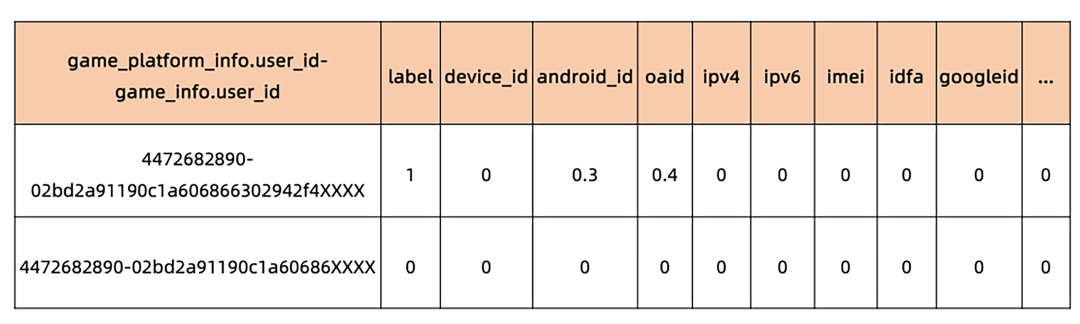 如上图所示,我们通过构建连通子图后,可以得到game_plaform_info.user_id1,game_plaform_info.user_id2,game_info.user_id1,game_info.user_id2这四个节点会关联到一个id上,但因为IP的权重较低,删除了被IP关联的边。也即是在连通子图中去掉game_info.user_id1这个点。此时,我们引入机器学习分类模型来学习节点类型权重。首先,我们先利用已有的用户行为表构建图模型,且得到连通子图;第二,我们利用游戏中存在一些标注数据:game_platform_info.user_id、game_info.user_id的映射关系来设置边的权重信息。我们可以建立一个分类模型,特征可以选取和user_id关联的顶点类型(device_id,oaid,IP等)以及时间戳。特征值是user_id和其他顶点的边的出现次数、距离现在的时间长度归一化的结果。下图是样本示例:第三,把这些节点权重代入到图模型中校正每个边的权重。第四,通过调节边权重的阈值来剪枝,在准确率和召回率中达到平衡。