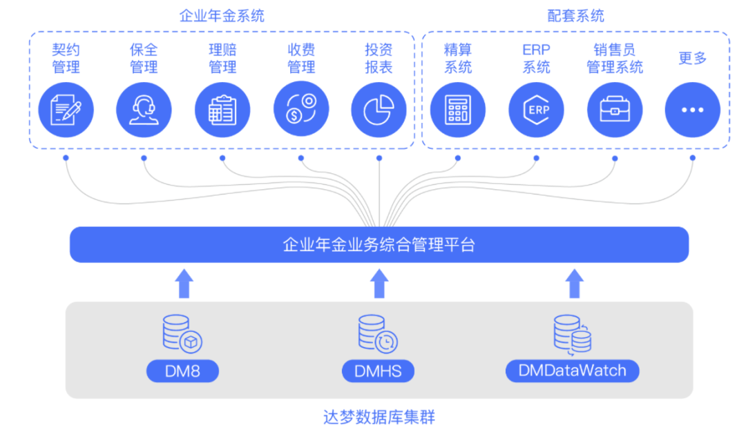企业年金系统(以下简称“年金系统”),是客户整体信息化架构下的六大核心生产系统之一,受托管理达千亿规模。达梦数据库作为该系统的核心生产库,为契约、保全、理赔、跨域收费付费、投资报表等业务模块,以及精算系统、ERP系统、MIS 系统(销售员管理系统)等周边配套系统,提供全面可靠的数据库服务。