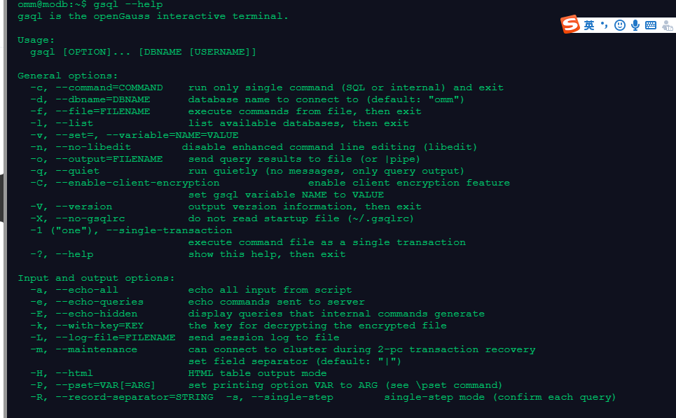 gsql是openGauss提供在命令行下运行的数据库连接工具,可以通过此工具连接服务器并对其进行操作和维护,除了具备操作数据库的基本功能,gsql还提供了若干高级特性,便于用户使用。