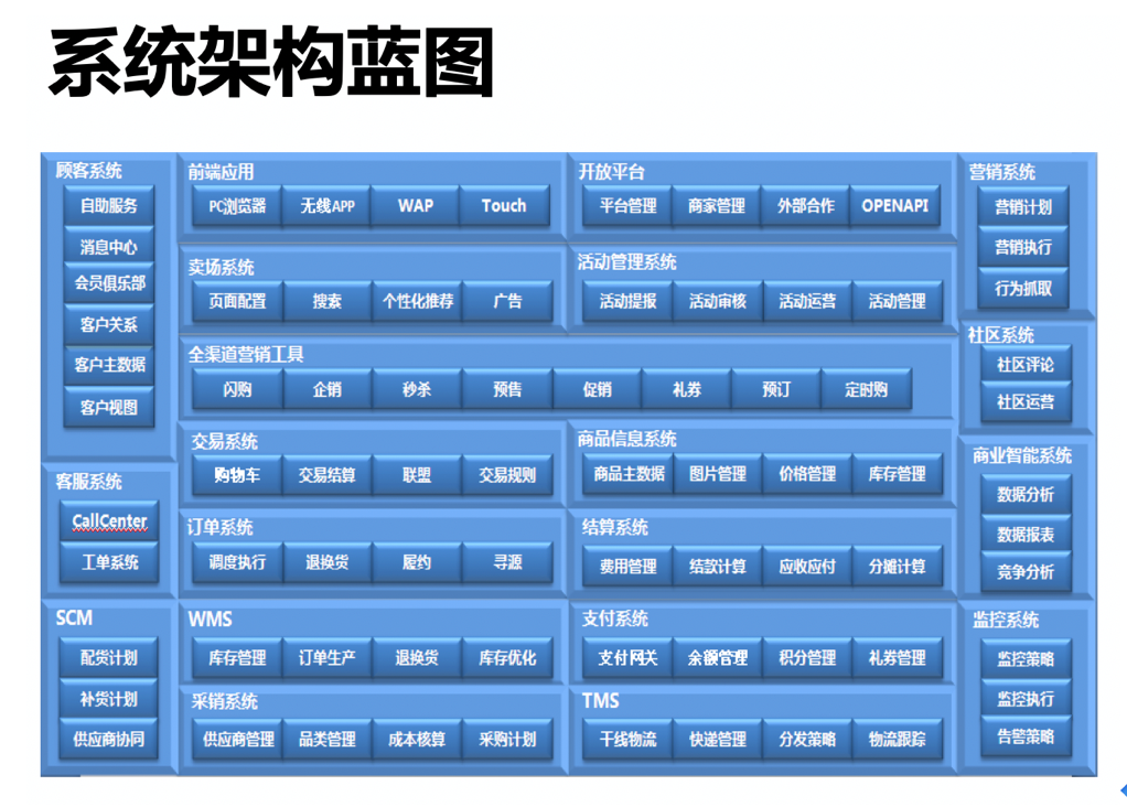 2014年初我开始负责架构部,开始扩充架构师团队,提升架构部整体能力。架构部要做架构总体规划,分为两部分,业务系统架构和技术架构。业务系统架构规划是一张蓝色的图,名副其实的蓝图,体现系统间的层次和关系,能让老板一眼看明白,不是技术层面的应用架构图。说一个“关键点”,几乎每一个框里都有4个功能模块,这正常吗?当然不正常,就是为了美观大方,所以主要是展示一个体系,一个思维模式,便于快速理解,并不是用来做系统设计。