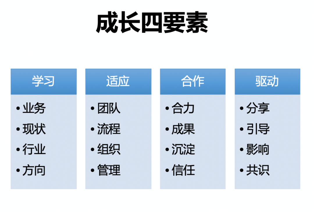 架构师进入新的团队,要成长,要成事儿,时间线如上所述,如果换一个视角来看这个过程,有四个要素:学习、适应、合作、驱动。这四个要素也是层层递进的关系。
