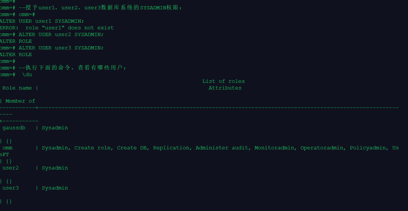 --授予user1、user2、user3数据库系统的SYSADMIN权限: