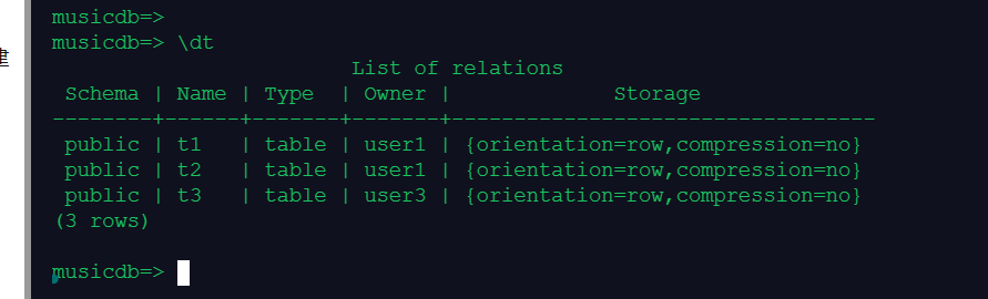 --以用户user3的身份在数据库musicdb中创建表t3,并插入一条数据: