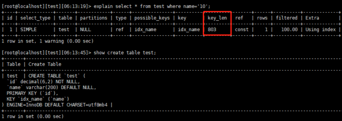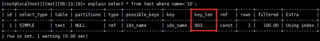 其中key_len列表示SQL使用的索引长度,单位为字节,通常在不损失精确性的情况下,长度越短越好。
