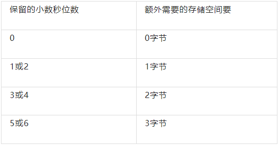 3、如果是日期时间型,还需要考虑精度值,在MySQL5.6.4版本之后,各个日期时间类型需要的存储空间如下: