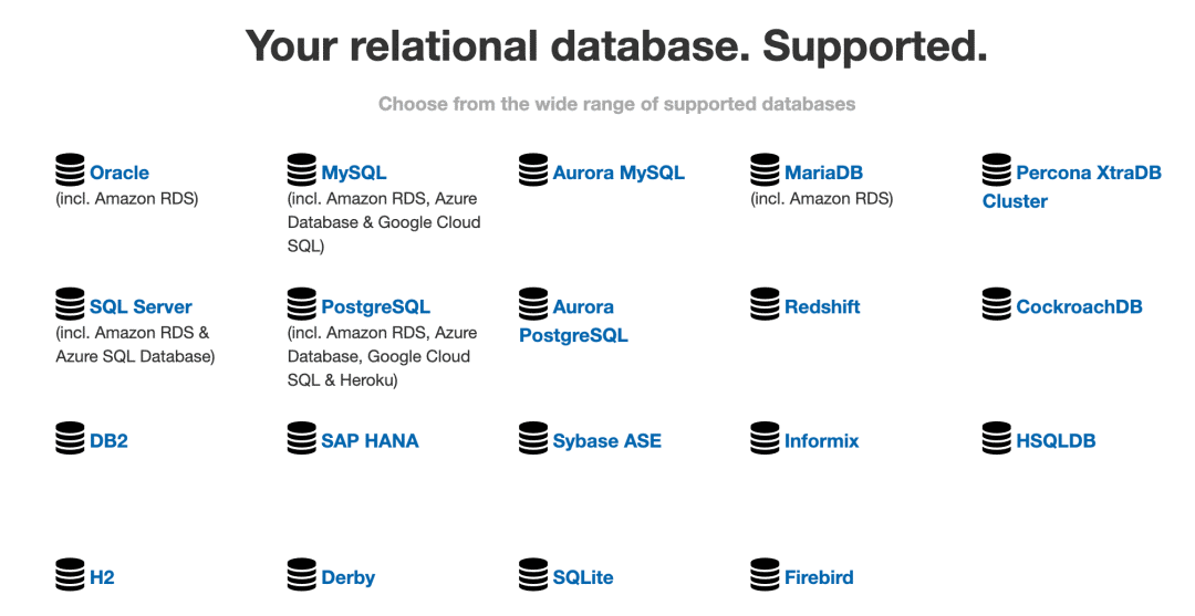 Flyway 支持的数据库,主要是关系数据库。如下图所示: