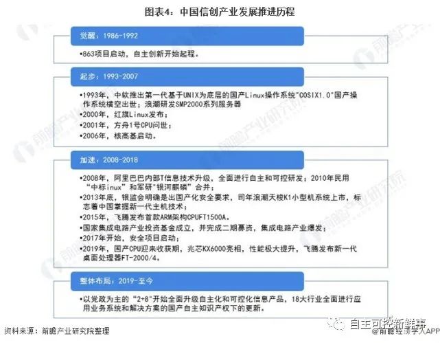 信创产业是中国坚持走信息技术应用自主创新之路的必然结果,以“863”计划为起点,共经历了“觉醒”、“起步”、“加速”、“可靠”和“整体布局”五个阶段,形成了以国家和科研机构为引导,大型国有企业和民营企业为实践突破的信创产业新局面。