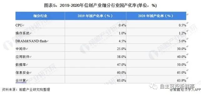 中国信创产业提出的核心为“国产化”,在本文定义的信创领域中,不同的细分领域现阶段国产化率也存在一定差异。前瞻在综合市场各方数据后对于现阶段中国信创各细分行业的国产化率进行了估测,得到数据结果显示,中国CPU和操作系统领域国产化比率相对较小,2020年两个领域国产化率分别仅为0.5%和1.2%,其未来可发展增长空间较大。2019-2020年国产化率变动幅度不大与中国中间件国产化替代进程和中间件企业供应能力受限有一定关系,但未来随着信创产业的发展,中间件国产替代进程或会出现较大规模增长。