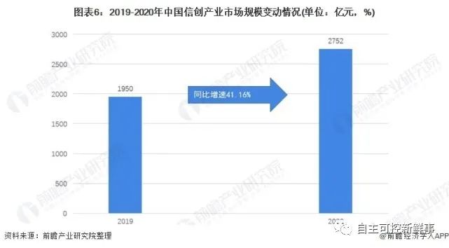 通过此逻辑,前瞻对于中国2019-2020年信创产业市场规模进行了测算,结果显示中国信创产业市场规模在2019-2020年分别为1950亿元和2752亿元,同比增长40.88%。