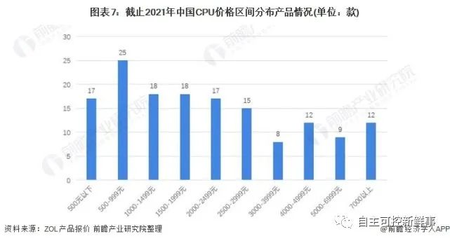 根据前瞻对市场上CPU产品查询整理来看,中国有报价的CPU共计153款,其中价格在3000元以下的CPU产品较多,其中500-1000元价格区间产品最多,达到25款,3000-4000元价格区间产品最少,仅有8款产品。从报价网站来看,目前中国报价清晰的CPU产品主要为Intel和AMD两家,龙芯出品的芯片产品基本没有详细网站报价情况。