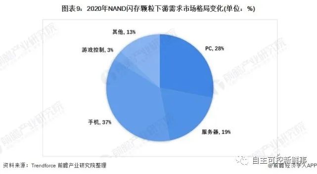 根据Trendforce的数据统计,2020年NAND闪存颗粒的下游需求市场以智能手机端为主,未来到2023年,智能手机板块的需求将小幅度上涨,而服务器的需求将大幅上涨,与此形成对应的则是在PC端的需求下降。