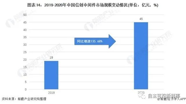结合2019-2020年中国中间件领域国产化率测算得到中国信创中间件市场规模分别为19亿元和45亿元,同比增长96.4%。