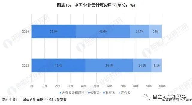 根据中国信息通信研究院的云计算发展调查报告,2019年中国已经应用云计算的企业占比达到66.1%,较2018年上升了7.5%。其中,采用公有云的企业占比41.6%,同比提高了5.2%;私有云占比为14.7%,同比小幅提升;有9.8%的企业采用了混合云,同比提高了1.7%。