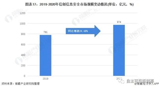 结合2019-2020年中国信息安全领域国产化率测算得到中国信创信息安全市场规模分别为781亿元和974亿元,同比增长24.68%。