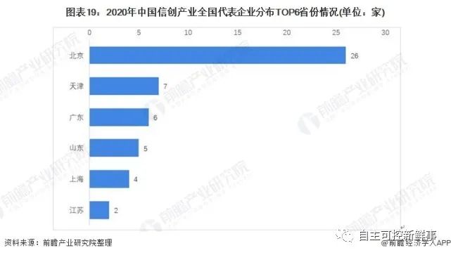 根据前瞻统计,从信创产业代表企业地域分布情况来看,北京优越的IT产业基础为信创产业提供支持,目前北京已形成以龙芯、统信、中科方德为核心的完整的信创产业链条覆盖,其信创企业分布共有26家;其次为天津,天津已建立以飞腾、海光、麒麟为核心的滨海信创产业园,并将围绕信创产业进行深化布局,代表企业共有7家。