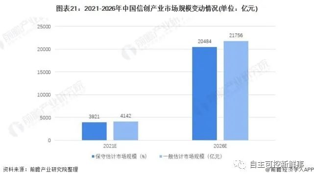 结合2021-2026年中国信创产业预计国产化率计算得到中国信创产业市场规模变动情况。在保守估计下,中国信创产业市场规模在2026年或将突破2万亿,2021-2026年年复合增长率为39.19%;在一般估计下,中国信创产业市场规模在2026年或将突破2.1万亿,年复合增长率为39.34%。