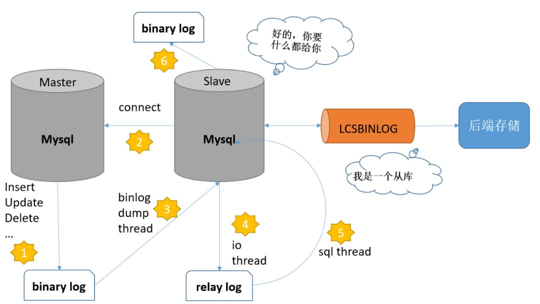 master(主库)在每次准备提交事务完成数据更新前,将改变记录到二进制日志(binary log)中 slave(从库)发起连接,连接到master,请求获取指定位置的binlog文件 master创建dump线程,推送binlog的slave slave启动一个I/O线程来读取主库上binary log中的事件,并记录到slave自己的中继日志(relay log)中 slave还会起动一个SQL线程,该线程从relay log中读取事件并在备库执行,完成数据同步 slave记录自己的binlog