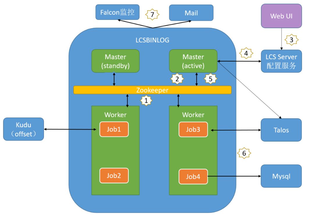 Worker节点通过在Zookeeper上注册告知自己可以被调度 通过在Zookeeper上抢占EPHEMERAL临时节点实现Master的HA 用户在融合云(Web)上注册BinlogSource同步任务 Master周期性从配置服务读取Binlog同步作业配置 Master更新Zookeeper中的调度信息 Worker节点 根据Zookeeper上的调度信息启动新分配任务,停止配置失效任务;作业启动后完成数据实时同步并周期性将同步进度记录在kudu中 服务上报监控信息到Falcon平台,作业异常退出发送报警邮件