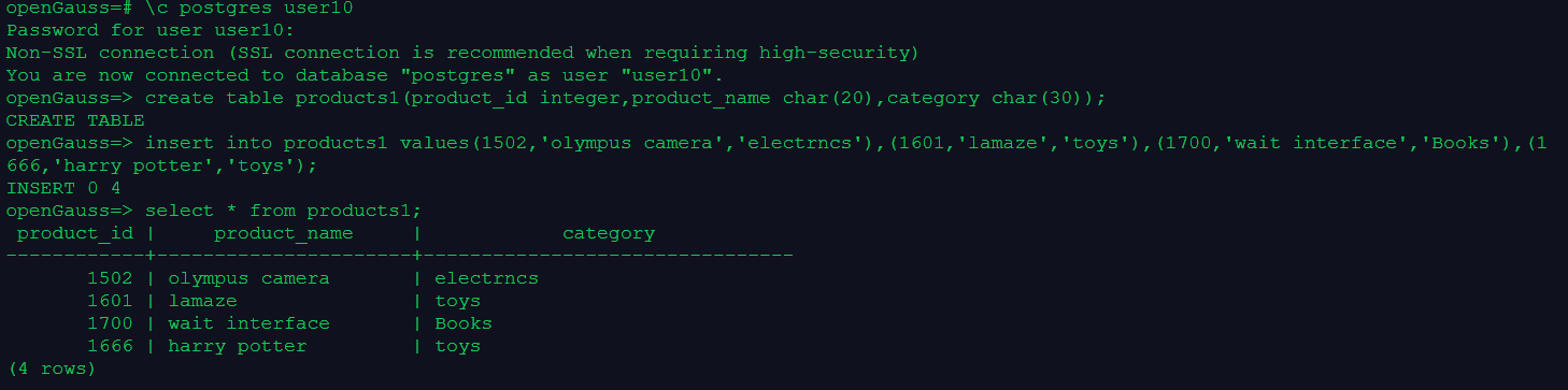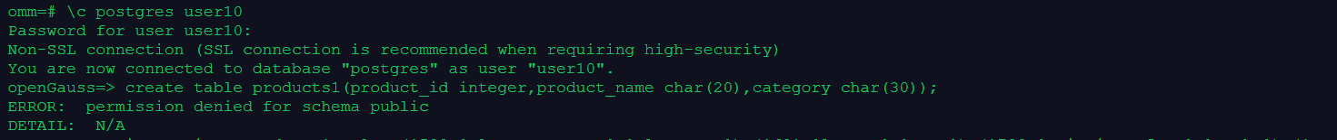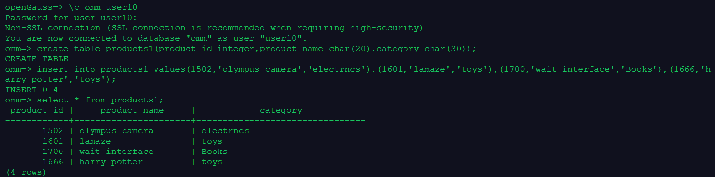 3.用户user10访问数据库omm,创建一个表并插入数据